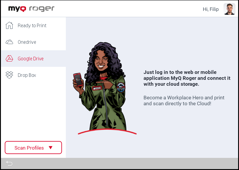 Wenn Sie sich durch Scannen des QR-Codes mit Ihrem Smartphone anmelden, können Sie alles über die MyQ Roger App verwalten. Sie können das Gerätepanel nur benutzen, wenn Sie Übergabe der Steuerung an den Drucker über die Schaltfläche in der oberen rechten Ecke der MyQ Roger Mobile App Startseite tab.