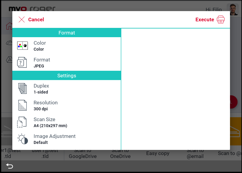 Scan an @me - Tippen Sie auf , um einen Auftrag zu scannen und ihn an Ihre E-Mail-Adresse zu senden, oder drücken Sie auf , um die Parameter anzuzeigen.