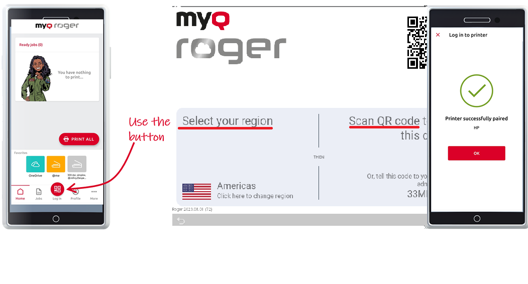 Pour enregistrer un périphérique d'impression auprès de votre locataire, vous devez d'abord sélectionner votre région sur le MFD, puis utiliser l'application mobile MyQ Roger pour scanner le code QR affiché sur le MFD.